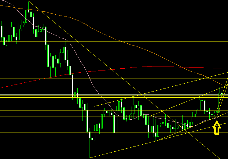4HMAでサポートされたのか微妙な感じではあった。が、15分でWボトムから、そろえた高値抜けだった。4HMAの下に損切りがおけるので、1Hが中段持ち合いになっても、そのまま耐えるつもりだった。