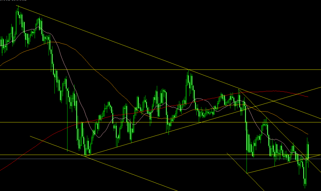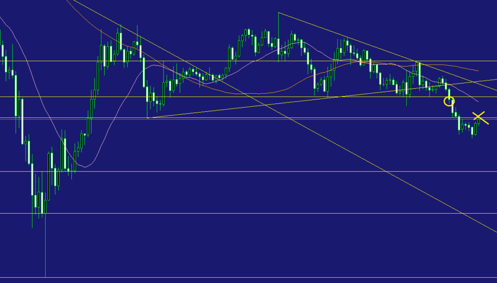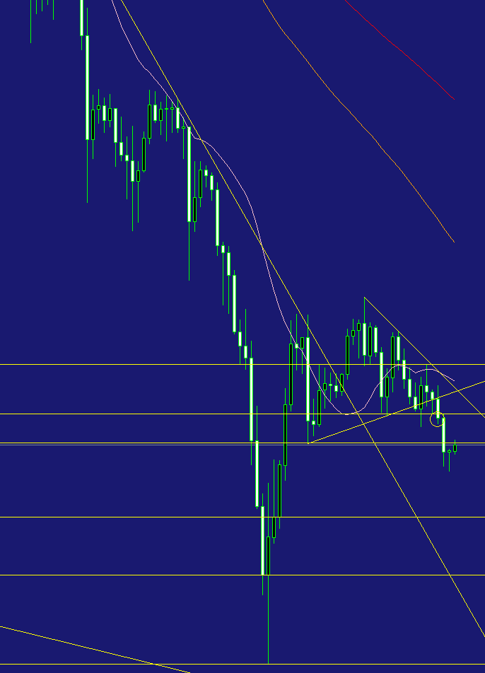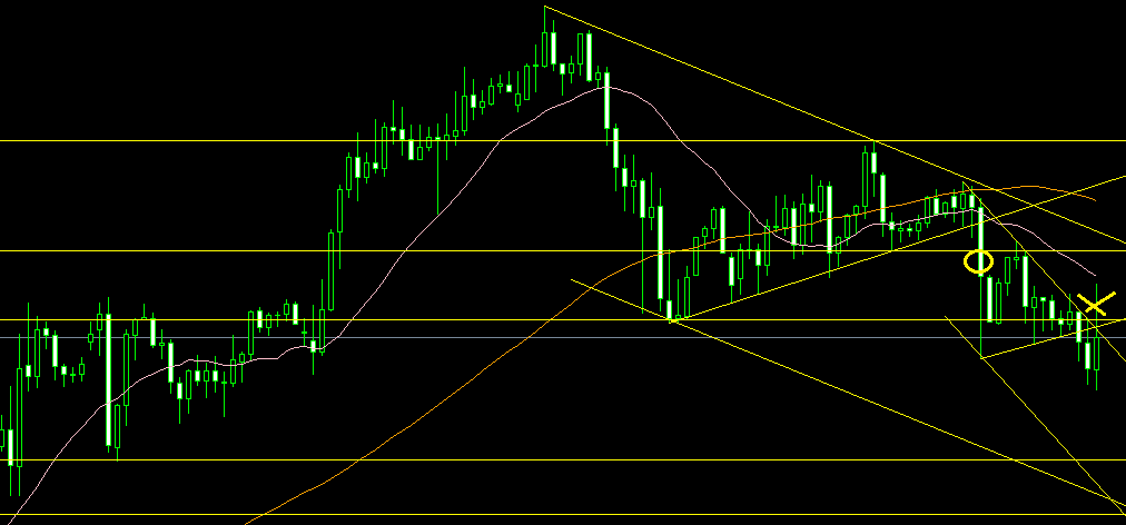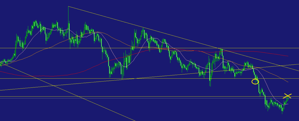 下落途中で持合いカウンター下抜け、4H前回安値を実体で割り込んだが、そのラインも再度超えてしまった。下落トレンドラインも超えてきた。手じまいです。