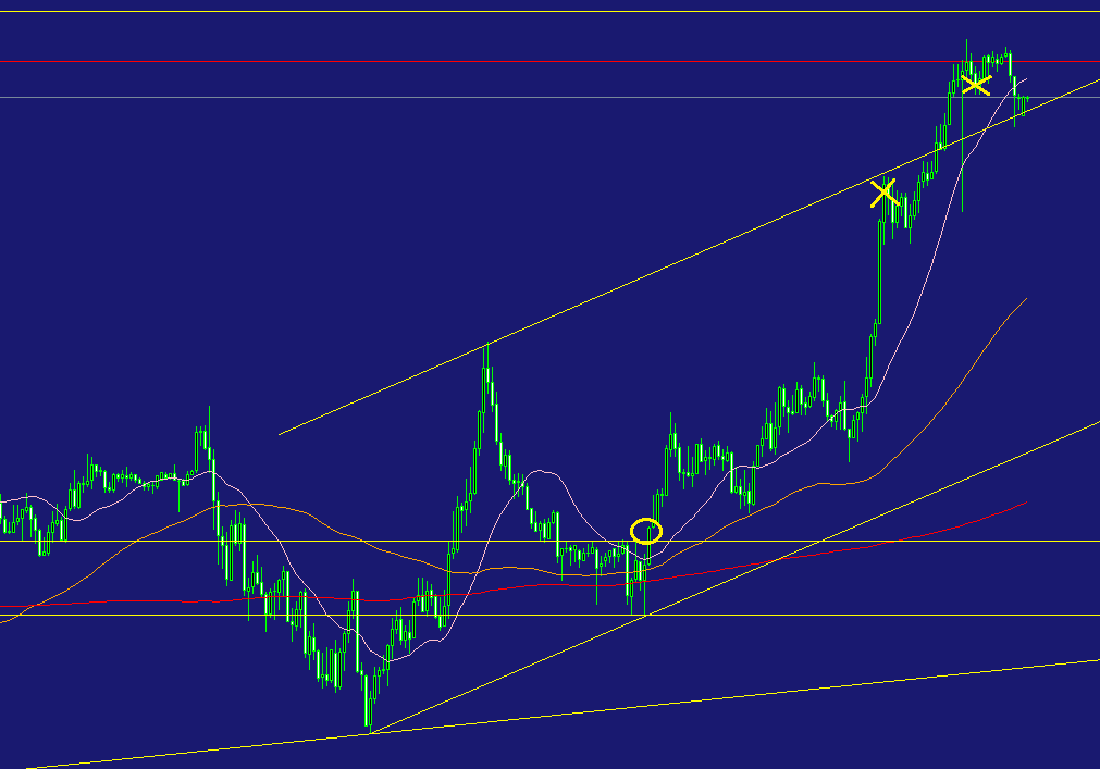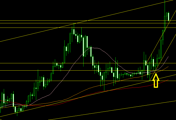 4HMAを上抜けての最初の押しはかなり押し込まれていた。そこから一気に高値更新。そしてその押しが4HMA付近でサポートされてきたので買いエントリした。