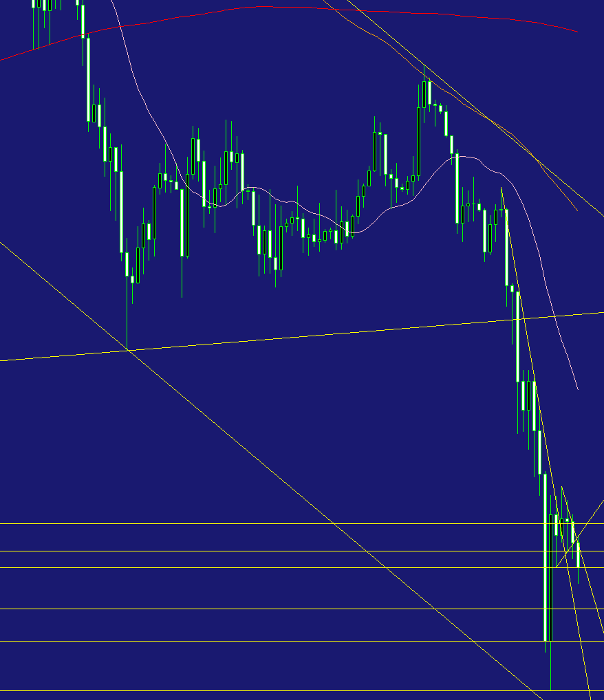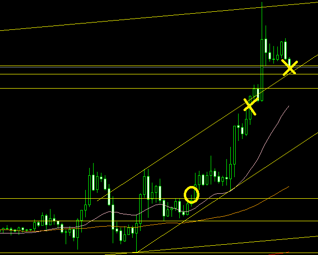 目標はチャネルと、引いたライン。金曜だし、値動きを見ながら分割利食いしていこうと思っていたが、全く届かず。いや、下げなさすぎでしょ。そこで反発するか?