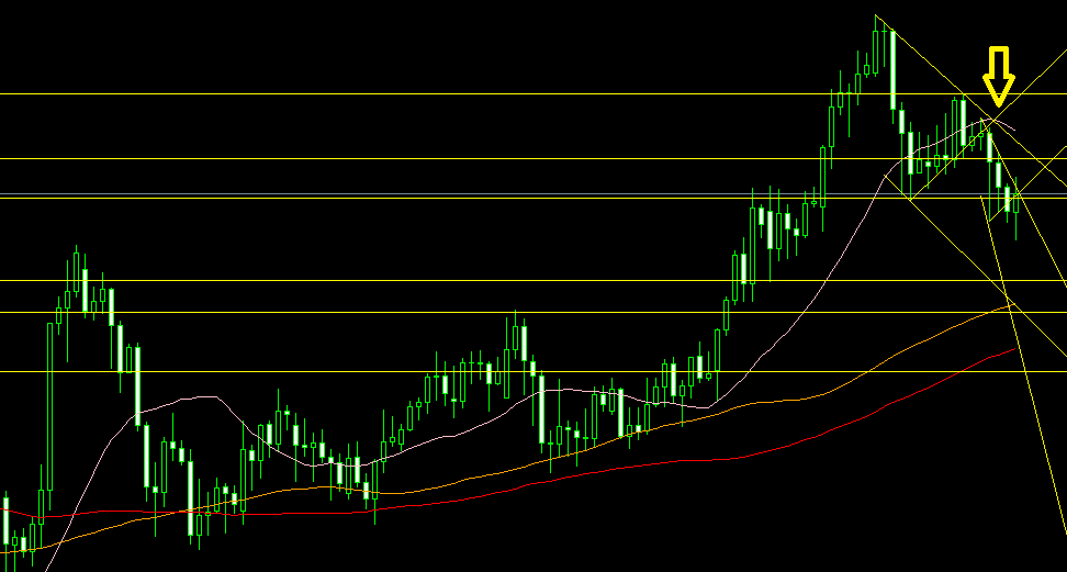 4H上抜けていたが、下抜けて戻し、MAに抑えられて下落という大好きな形。