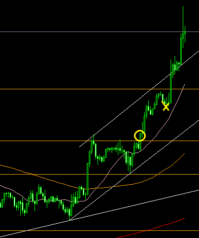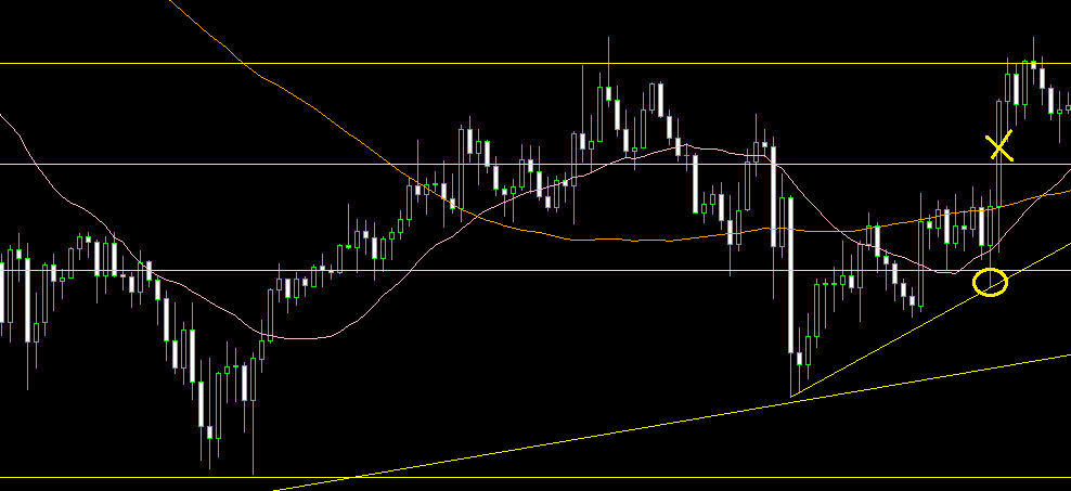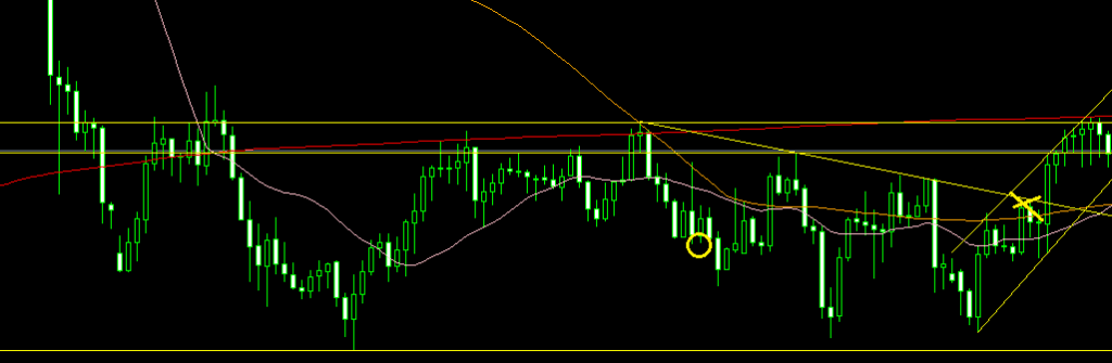 黄色〇で売りエントリ。×で損切り。問題はその後、、。