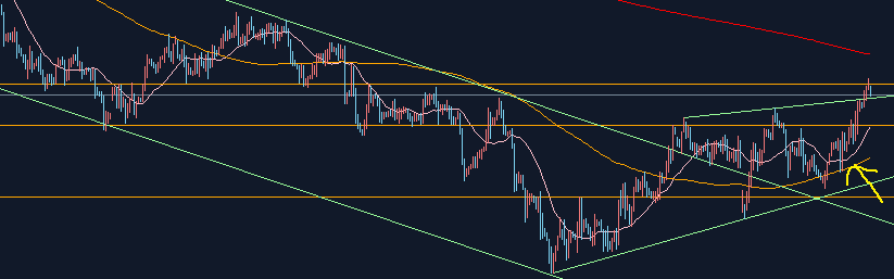 週足レベルの上昇トレンドラインが直下にいて、そこで4Hが安値切り上げようとしている場面だった。そこで売るというのは、、自殺行為だった。