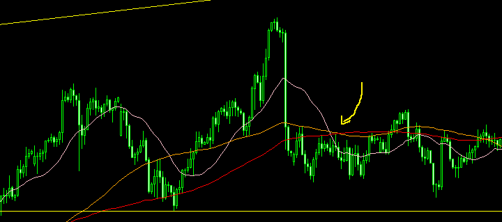 4HMAの波を見れば分かるが、これは高値切り下げがない。だから、MAのクロスとは無関係に売っては駄目な局面。
